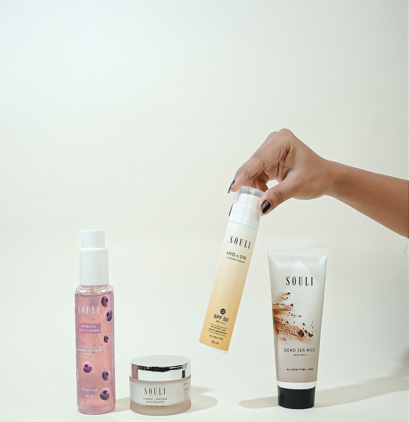 Four Souli essentials deliver nourishing hydration and a healthy glow at every step of your routine — Cleanse, Treat, Hydrate, and Protect. Use them as your morning and evening skincare steps, layer them under makeup for smooth skin prep, and take them with you for instant hydration and lasting radiance on the go.